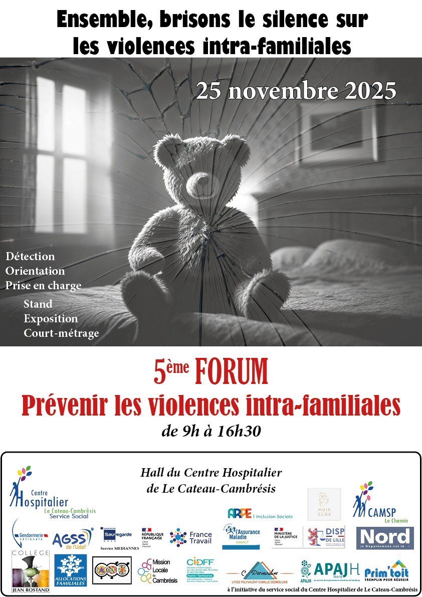 Le 25 novembre 2025, à l’occasion de la Journée internationale pour l’élimination des violences faites aux femmes, le Centre Hospitalier de Le Cateau-Cambrésis a organisé son 5ᵉ Forum “Prévenir les violences intra-familiales”.