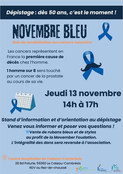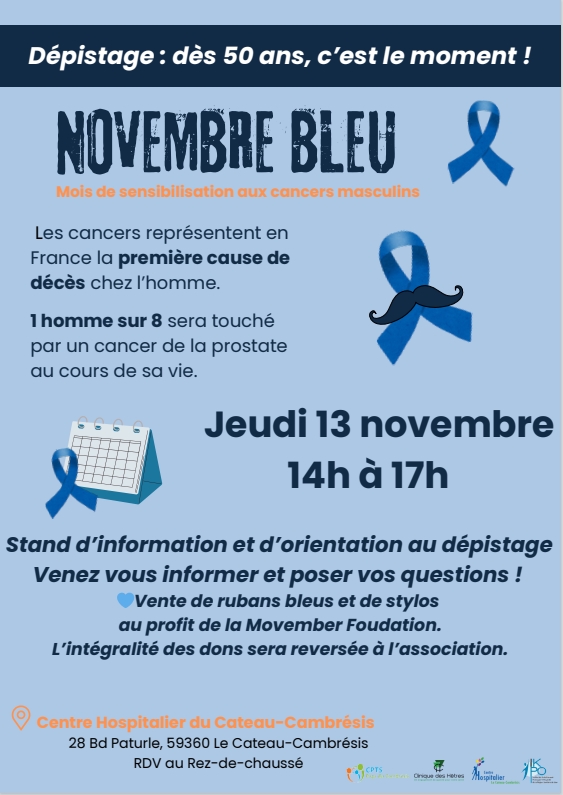 Après Octobre Rose, le Centre Hospitalier de Le Cateau poursuit son engagement pour la prévention des cancers avec Novembre Bleu, mois de sensibilisation aux cancers masculins.
